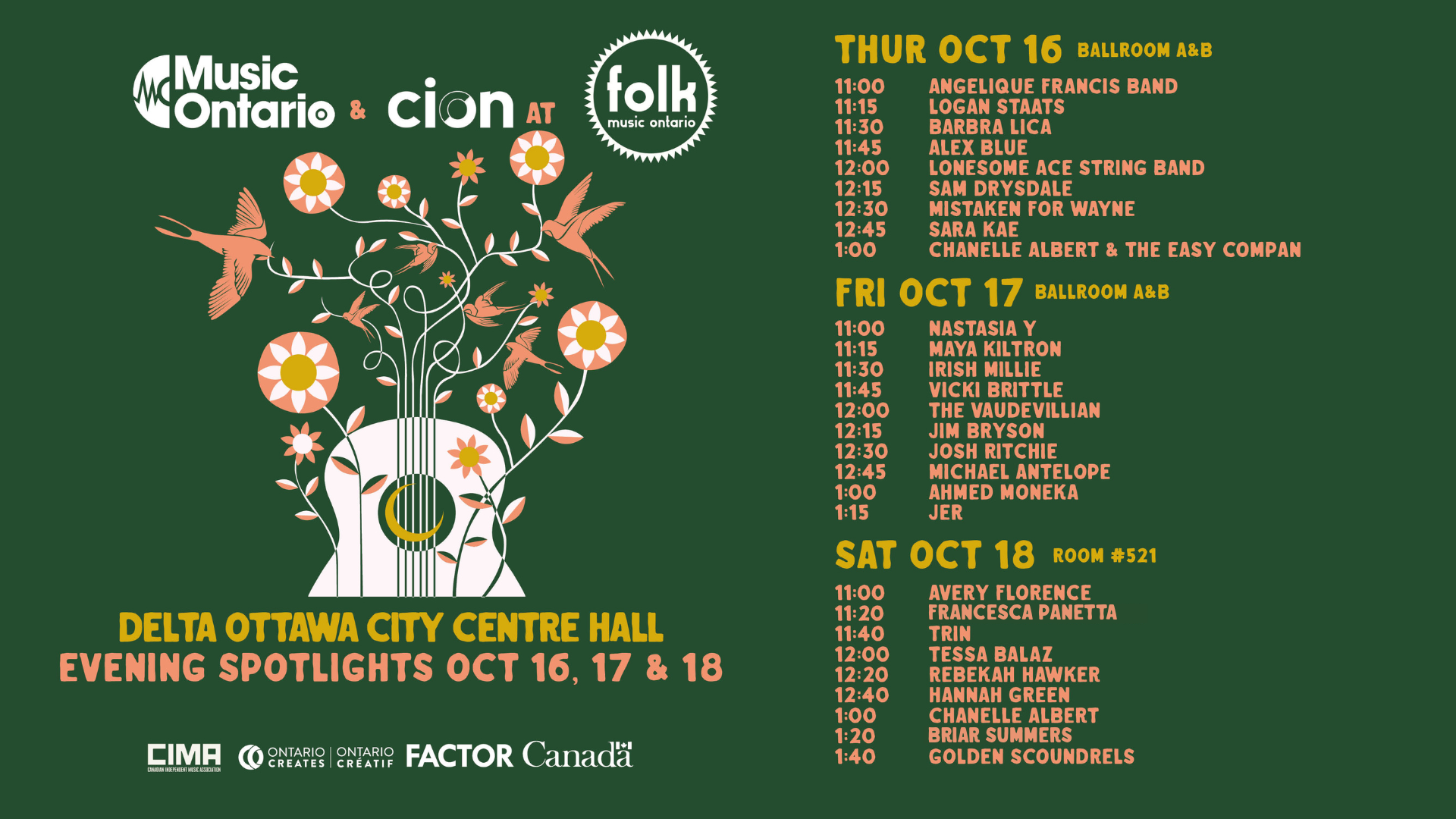 MusicOntario is excited to partner with the Cultural Industries Ontario North (CION) to present two nights of spotlight showcases and one night of private showcases at Folk Music Ontario (FMO) October 16th - 18th ! For the private suite showcases on October 18, 2025 (11pm-late!), we welcome applications from folk artists from across Ontario and from any folk tradition.