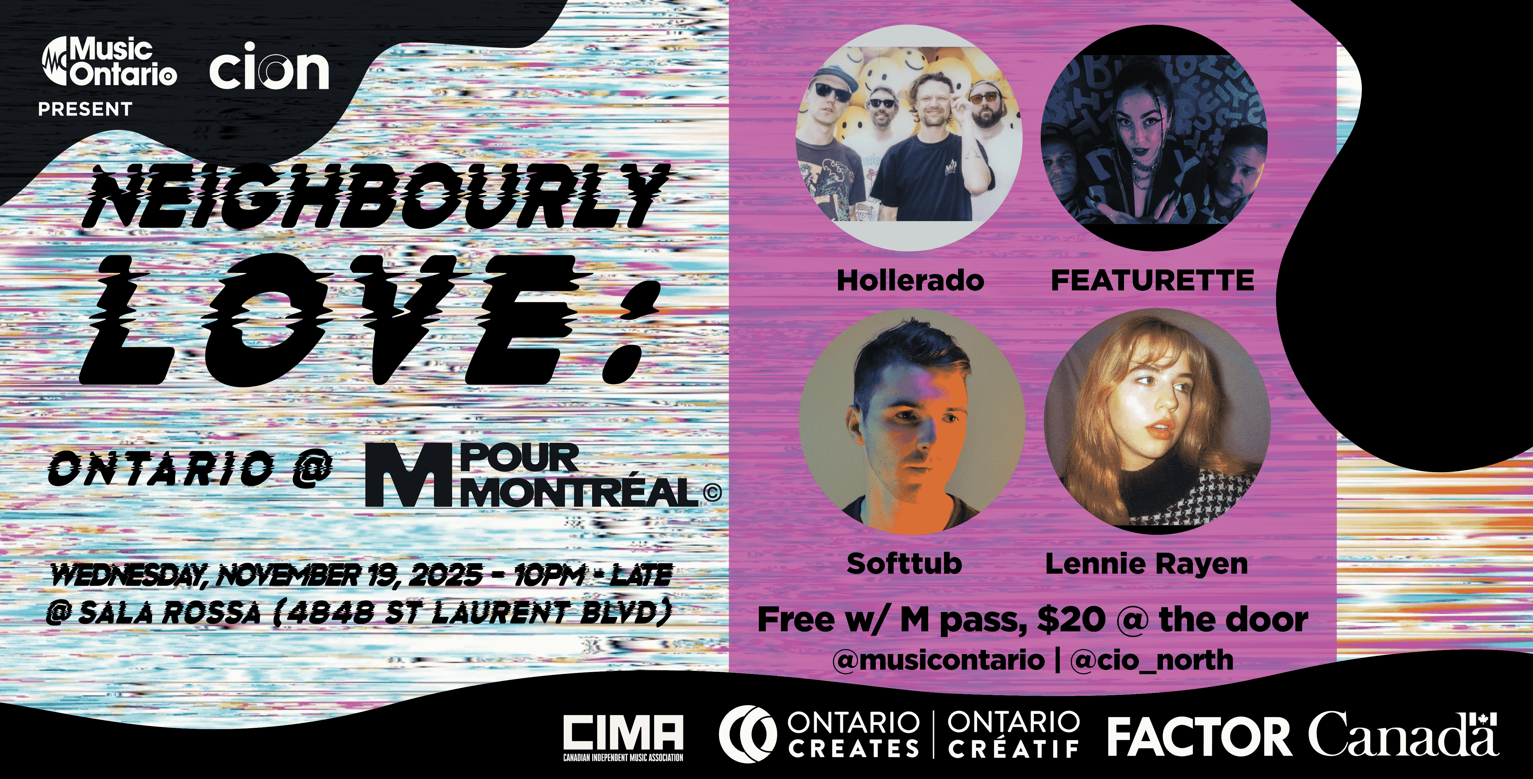 In partnership with Cultural Industries Ontario North (CION) and CIMA, MusicOntario is excited to announce our lineup of Ontario-based artists showcasing at this year's M for Montreal, taking place from Thursday, November 20 to Saturday, November 23, 2025, in Montréal, QC.