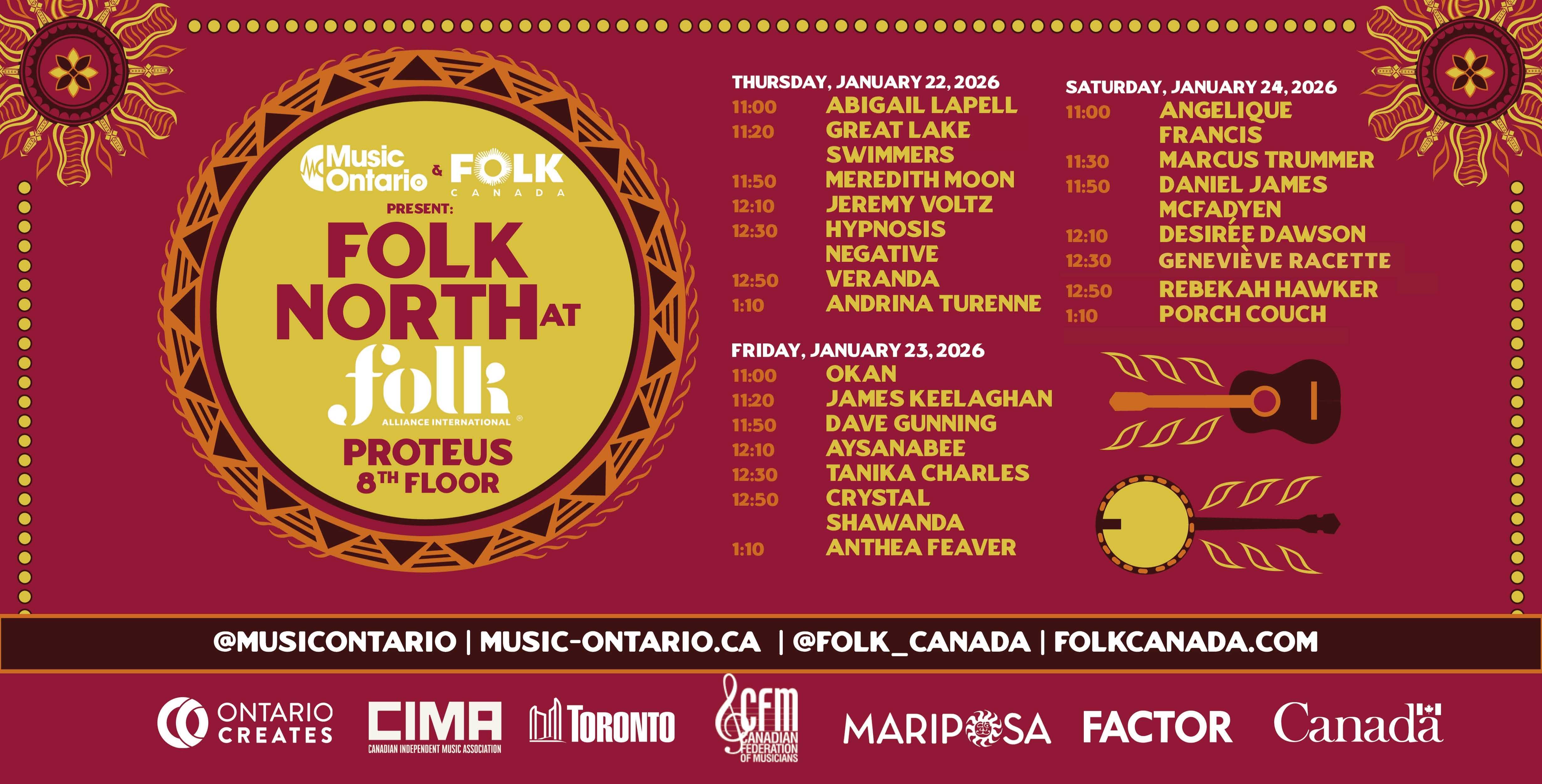 MusicOntario and Folk Canada are joining forces under the FOLK NORTH banner to host three nights of private showcases at Folk Alliance International (FAI) in 2026.