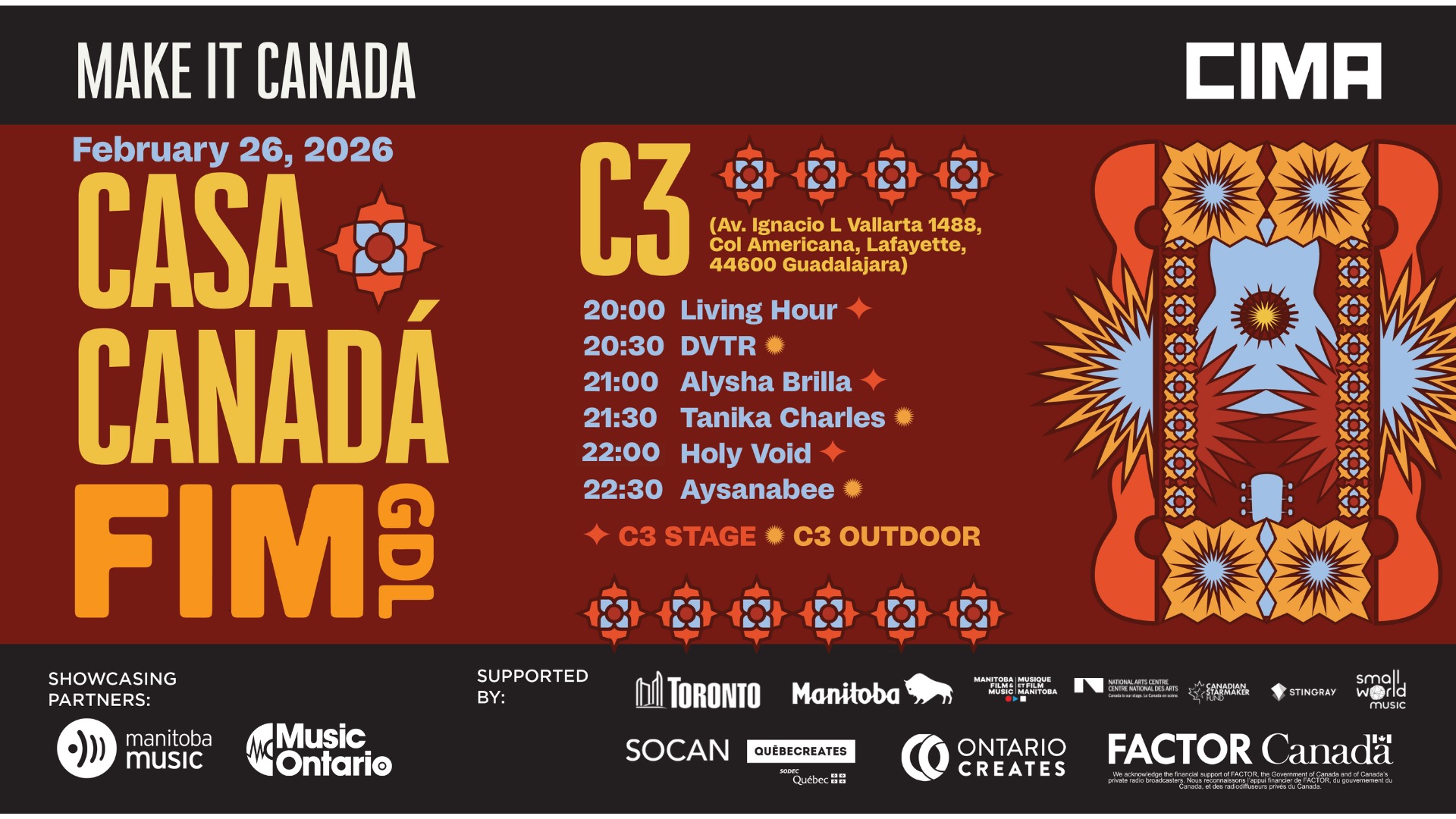 MusicOntario is excited to announce the 2026 edition of the FIMGDL Festival lineup. In partnership with CIMA, Manitoba Music and other partners, we will be returning to Mexico from February 25–28 for the 2026 edition of the FIMGDL Festival and Conference in Guadalajara. Recognized as one of the most important music conferences in Mexico and Latin America, FIMGDL brings together top emerging international artists and more than 1,000 key players from the local, national, and international music industries across Latin America. The Casa Canada Showcase will take place on Thursday, February 26, from 8:00 PM to 11:00 PM at C3 (Av. Ignacio L. Vallarta 1488, Col. Americana, Lafayette, 44600 Guadalajara). The showcase will feature performances by: